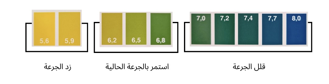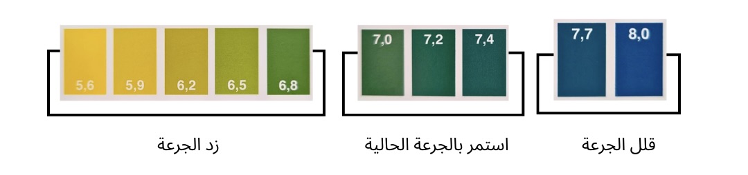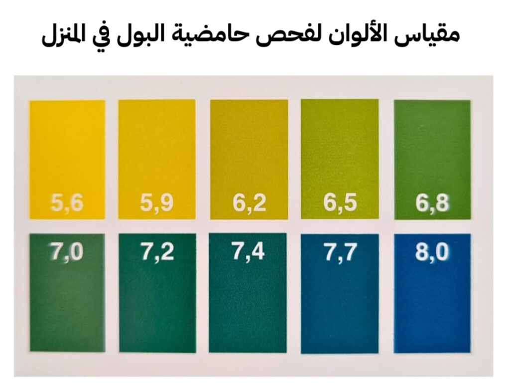 يُقاس باستخدام ورق القياس الخاص المرفق (شرائط ورقية صفراء ومقياس ألوان مع أرقام pH):